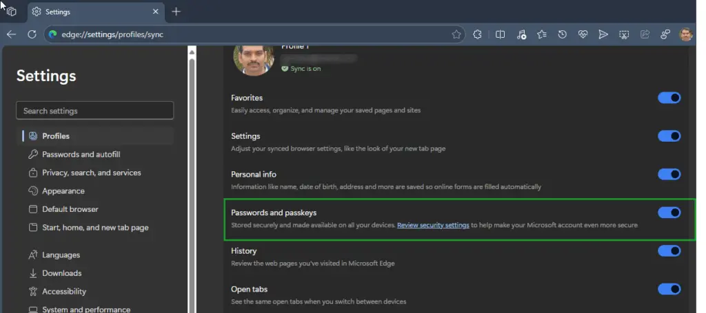開啟后,Edge 在“個人資料 > 同步”中會新增“密碼和通行密鑰”選項,提示用戶:“安全存儲并在所有設(shè)備上可用。查看安全設(shè)置以進一步保護您的 Microsoft 賬戶。”