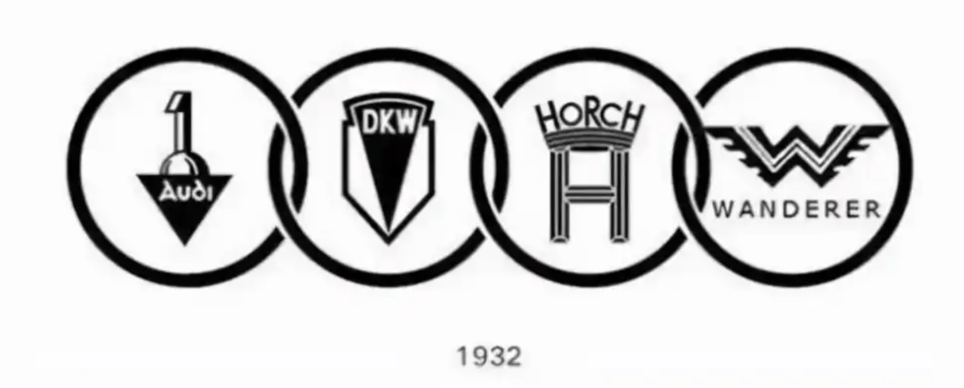 四環(huán)標志是奧迪最經(jīng)典的品牌符號,它的誕生可追溯到1932年。當時,奧迪(Audi)、霍希(HOECH)、DKW和漫游者(WANDERER)四家位于德國薩克森州的汽車制造商合并,成立了汽車聯(lián)盟公司(Auto UnionAG),成為德國第二大機動車制造集團,如今的奧迪公司便以此為根基。