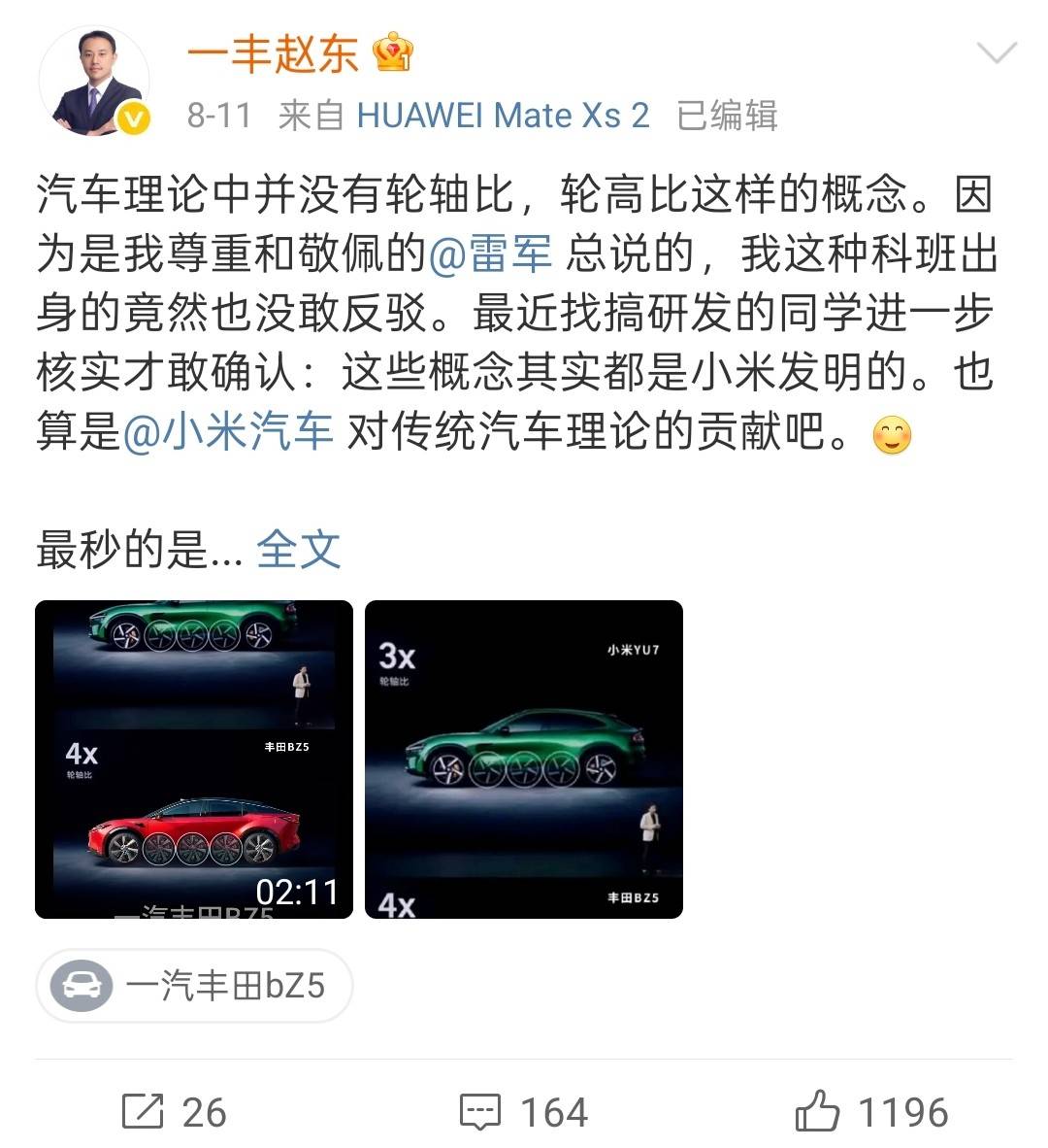 不過從結果來看,小米的宣傳還是挺成功的,有不少車企都在效仿。包括指出錯誤的一汽豐田高管趙東,在指出錯誤后也立刻“找補”,表示雷總是商業天才,是他尊重和佩服的同行,但天才也會偶有失誤的時候,自己要學習雷總的思想和方法論。