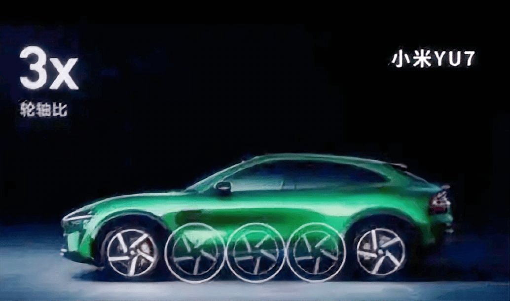 首先,輪軸比這個概念,其實是雷軍第一次提出來的。小米的官方PPT也做了展示,在小米YU7的前后輪之間,塞進了3個輪胎,這大概就是雷軍“3倍輪軸比”的由來。