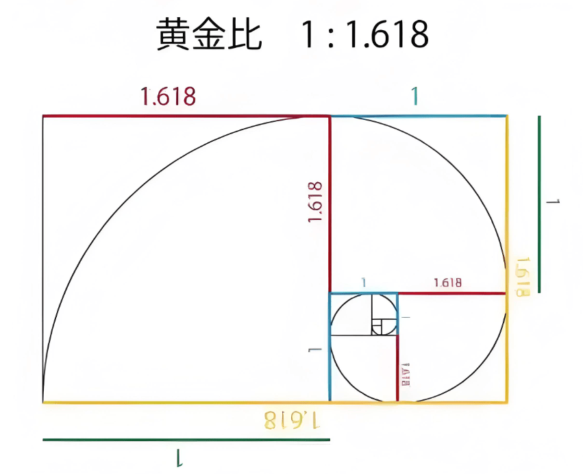 “黃金比例”這個概念來自于 “自我相似”的比例分割,就是把一個長段與一個短段連在一起,長段是整體的 0.618 倍,短段是長段的 0.618 倍,形成 “無限嵌套”。