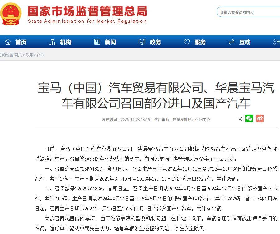 11月28日,國家市場監督管理總局發布消息,寶馬汽車召回多款電動汽車,含i7/iX/i5/iX1/i3,主要原因電氣驅動單元存在失去動力風險。