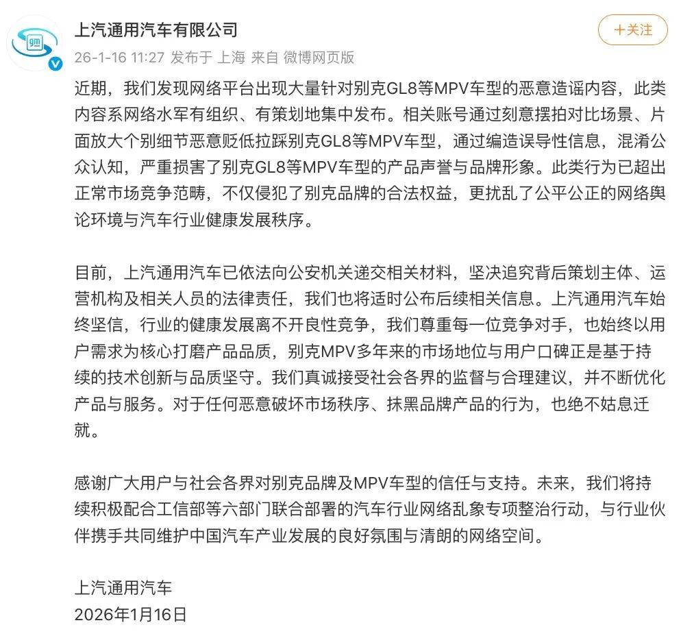 面對抹黑,上汽通用也忍不了了。1月16日,上汽通用發布聲明稱,近期網絡平臺出現大量針對別克GL8等MPV車型的惡意造謠內容,此類內容系網絡水軍有組織、有策劃地集中發布。