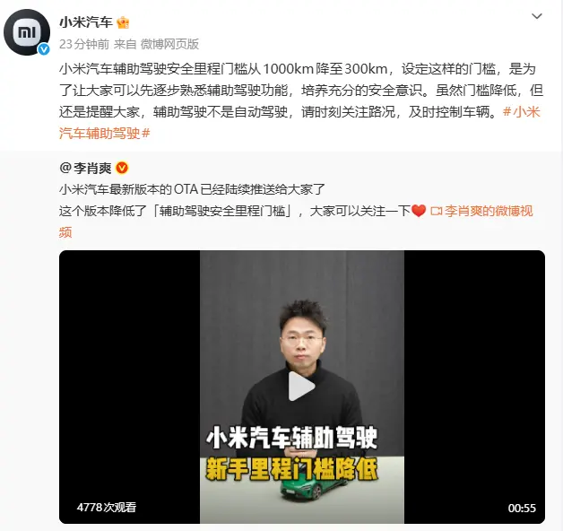 2月4日,小米汽車通過官方微博宣布,其車輛輔助駕駛功能的“安全里程門檻”已由最初的1000公里降低至300公里。此次調(diào)整旨在降低用戶使用輔助駕駛功能的初始門檻。