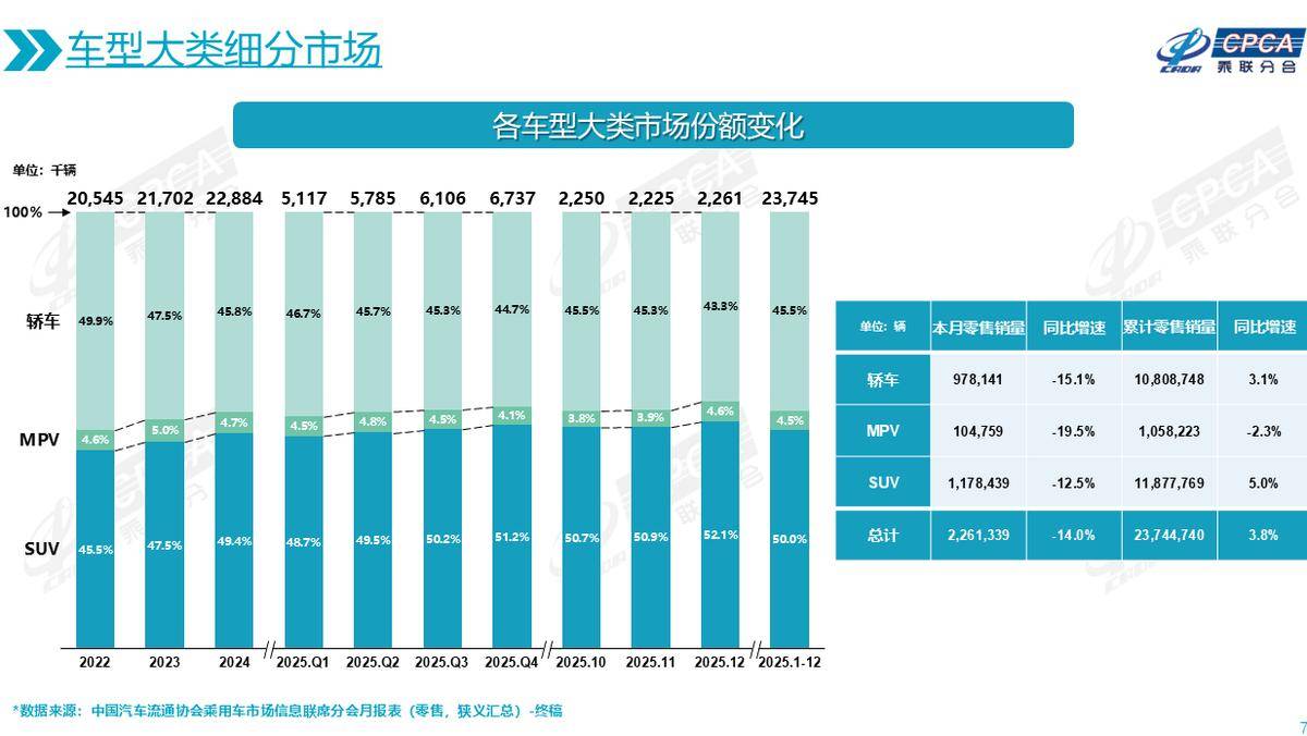 按照乘聯會統計的數據,2025年全年,SUV銷量同比增長5%,轎車銷量同比增長3%,MPV銷量同比下滑2.3%。