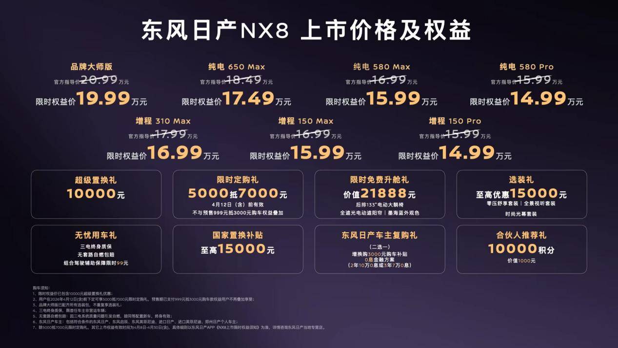為滿足中國(guó)家庭的多元需求,東風(fēng)日產(chǎn)NX8提供兩大動(dòng)力、六大版本。增程版提供310 Max、150 Max和150 Pro三種選擇,官方指導(dǎo)價(jià)分別為17.99萬(wàn)元、16.99萬(wàn)元、15.99萬(wàn)元;純電版提供650 Max、580 Max和580 Pro三種選擇,官方指導(dǎo)價(jià)分別為18.49萬(wàn)元、16.99萬(wàn)元、15.99萬(wàn)元。