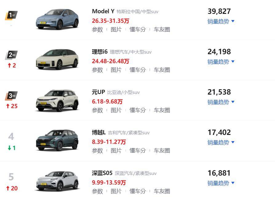 比亞迪元UP和深藍S05這兩款車型的銷量排名都出現大幅度提升,月銷量分別為2.1萬輛和1.6萬輛,分別位居排行榜第三和第四。目前這兩款車型的終端優惠都比較大,再加上不錯的綜合表現,也是吸引了眾多消費者的購買,就是不知道4月份還能不能穩定在前五,畢竟10萬級車型競爭太過激烈了。吉利博越L成為唯一進入前五的燃油SUV車型,該車的銷量還是非常堅挺,就是不知道能不能面對眾多新能源車型的沖擊,該車還能不能保持在前列。
