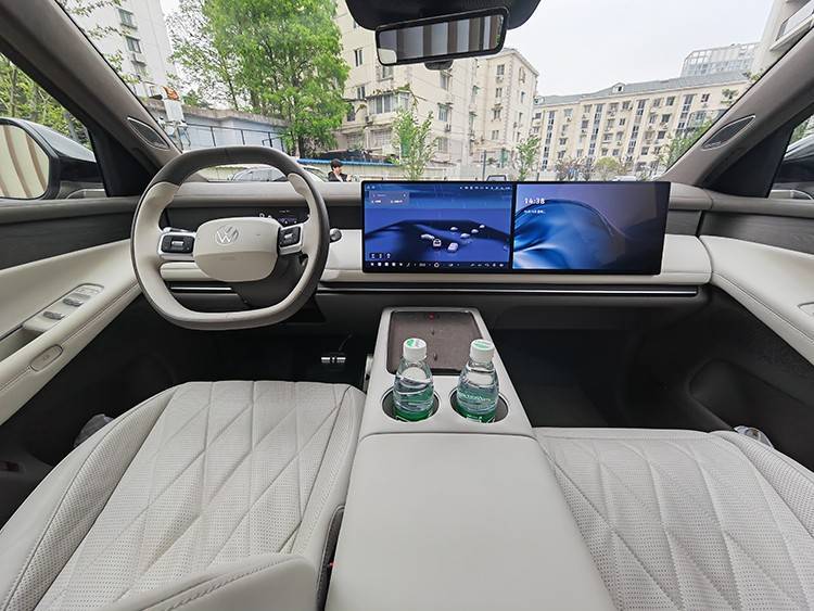 內飾方面,新車車內采用環抱式座艙架構設計,中控臺配備雙15.6英寸中控屏和副駕屏,并將儀表顯示功能融入到中控臺的木紋飾板內。