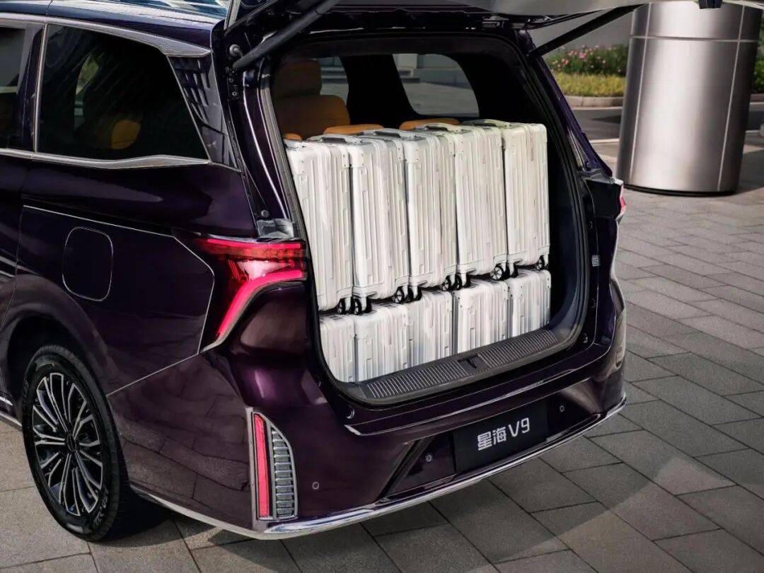 但星海V9給出了不同的解決方案:同級唯一第三排4/6分下沉式放平設(shè)計。常規(guī)七座狀態(tài)下,后備箱容積593L,7個20寸行李箱+7個背包綽綽有余;需要拉大件時,將第三排完全下沉,容積瞬間拓展至2616L——嬰兒車、露營帳篷、燒烤架、甚至一輛折疊自行車都能輕松吞下。更妙的是,下沉后形成一個1.7米長的純平地臺,跑長途累了可以鋪上氣墊當(dāng)臨時小憩空間,這個“一車多用”巧思是相當(dāng)優(yōu)秀。