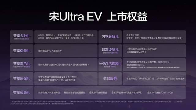 比亞迪王朝正在構建一個從購車、用車、到養車的全鏈路無憂體系。為此,宋Ultra EV帶來了“0元購、0元用、0元養”的超重磅購車權益!同時還有其他豐富權益,為用戶帶來超值購車體驗。